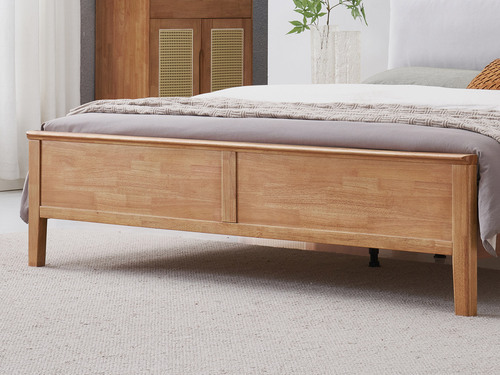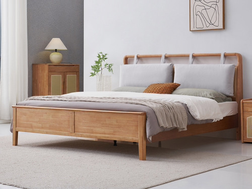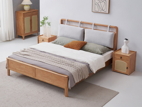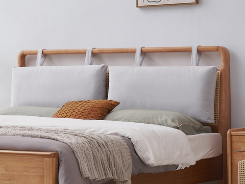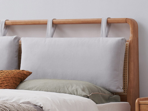 山有木兮 侘寂風 藤編床頭設計 可拆卸公仔棉靠包 泰國進口橡膠木 厚實柔軟絨布面料 靜音床板